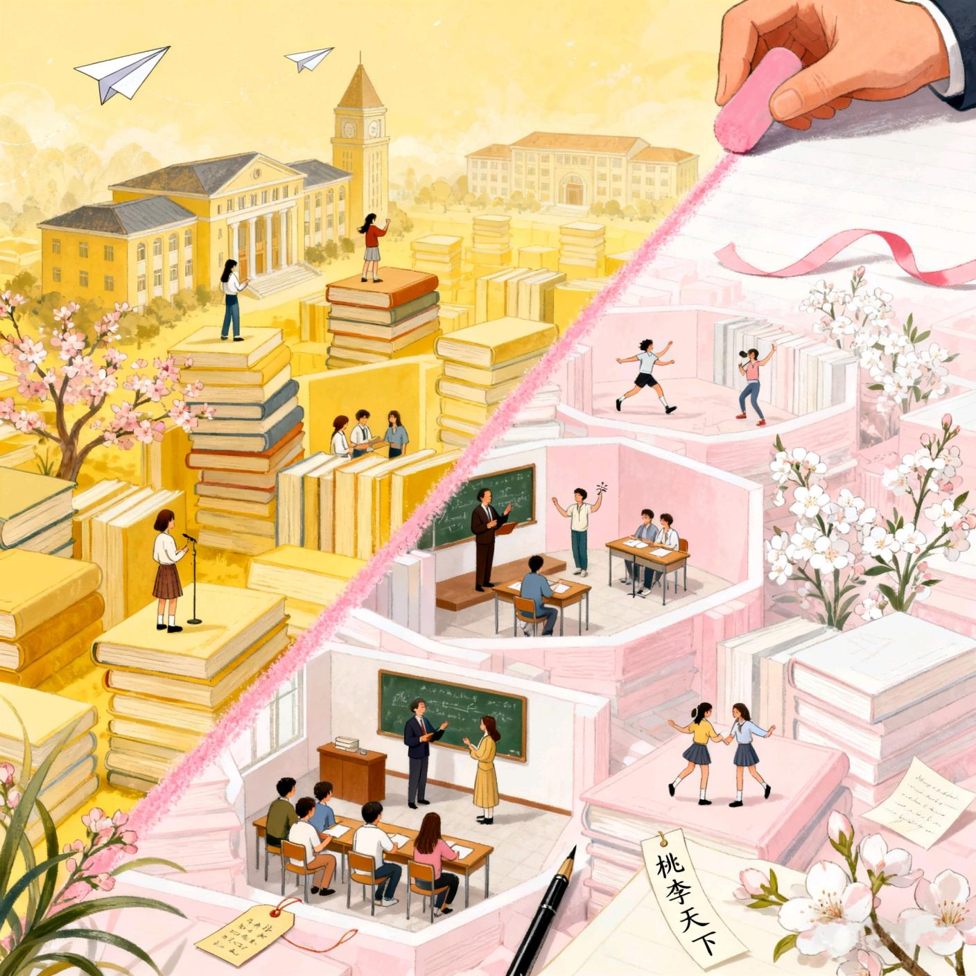 画面中,粉笔划出的粉线将场景分隔,一侧是堆叠的书籍与大学建筑,老师或在书堆上指导,或与学生交流;另一侧是教室、活动空间,学生们专注学习、肆意青春。