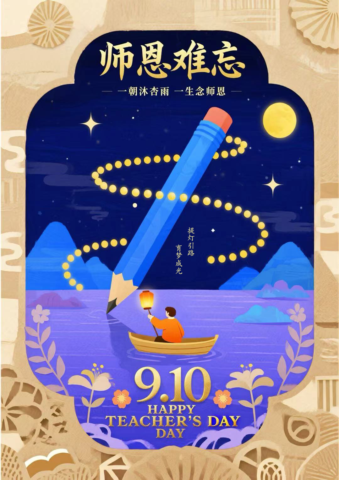 采用传统中式边框,融入祥云等元素,充满文化底蕴。毛笔造型与金色星光路相衬,展现老师以文化为墨,为学生铺就成才坦途。人物古装乘舟,更添古典意境,凸显师恩的深厚绵长。