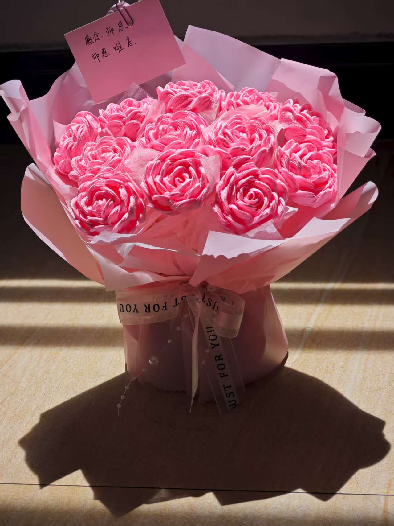 这束粉色纸玫瑰手捧花是教师节感恩礼物。以多层粉色皱纹纸剪裁花瓣,经卷曲、折叠、层叠制成十余朵立体玫瑰,花瓣边缘手工揉捻出自然纹理。左上方以银色回形针别着粉色便签,手写“感念师恩 师恩难忘”。