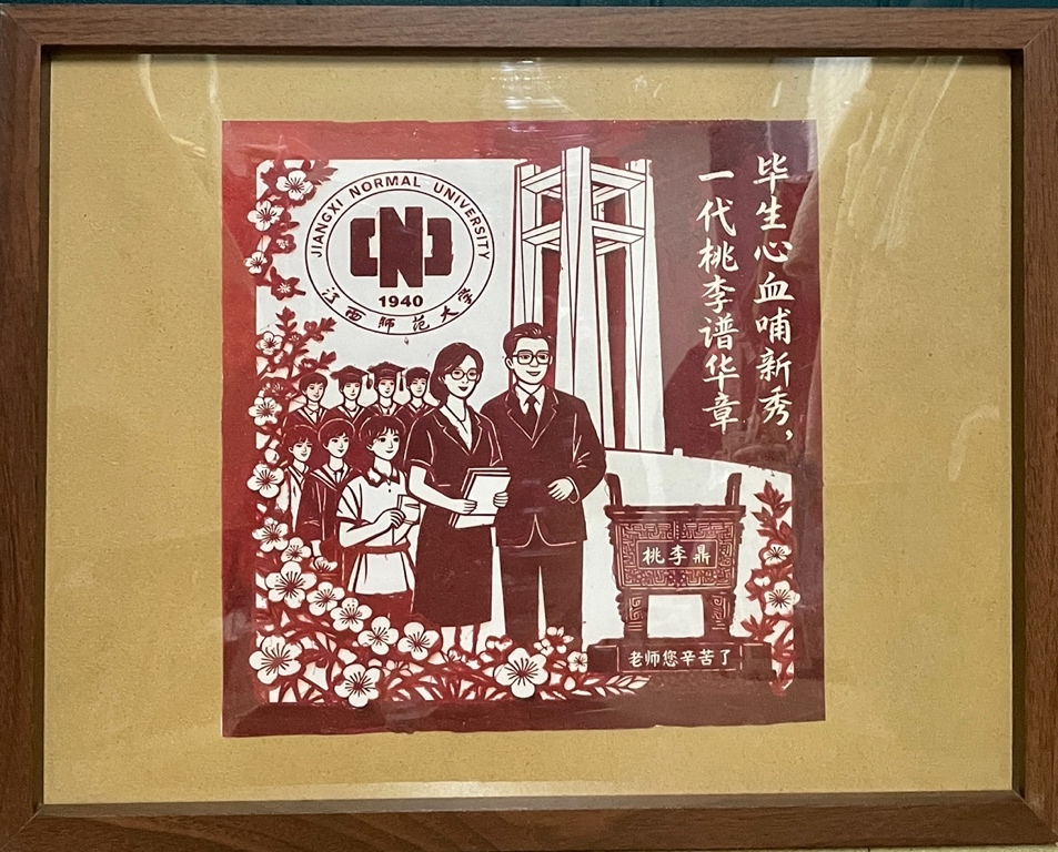 这幅剪纸风格纹理沙画以“毕生心血哺新秀一代桃李谱华章”为核心意境,将传统剪纸的细腻线条与沙画的灵动质感相融合。画面中,“桃李鼎”的轮廓以剪纸纹路勾勒,象征教师如鼎般坚实的育人担当;“老师您辛苦了”的字样藏于沙粒纹理间,传递出质朴真切的感恩之情。沙的流动感呼应着教师春风化雨的教诲,剪纸的规整感寓意师德的严谨厚重。作品既展现了对教师辛勤付出的敬意,也体现了新时代研究生传承尊师美德、践行社会主义核心价值观的真挚心意,愿以这份创意之作,致敬每一位深耕讲台、铸魂育人的师者!